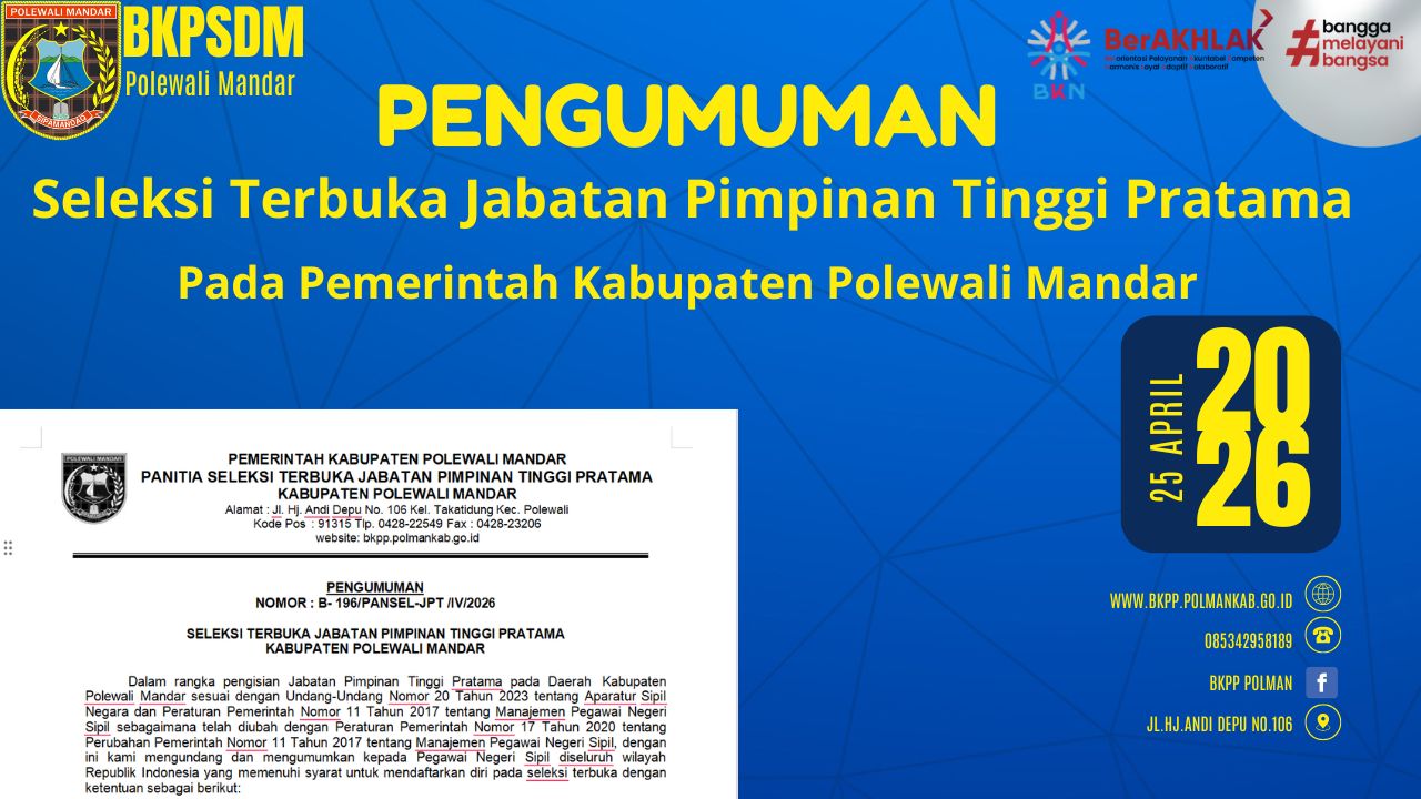 Dalam rangka pengisian Jabatan Pimpinan Tinggi Pratama pada Daerah Kabupaten Polewali Mandar sesuai dengan Undang-Undang Nomor 20 Tahun 2023 tentang Aparatur Sipil Negara dan Peraturan Pemerintah Nomor 11 Tahun 2017 tentang Manajemen Pegawai Negeri Sipil sebagaimana telah diubah dengan Peraturan Pemerintah Nomor 17 Tahun 2020 tentang Perubahan Pemerintah Nomor 11 Tahun 2017 tentang Manajemen Pegawai Negeri Sipil, dengan ini kami mengundang dan mengumumkan kepada Pegawai Negeri Sipil diseluruh wilayah Republik Indonesia yang memenuhi syarat untuk mendaftarkan diri pada seleksi terbuka dengan ketentuan sebagai berikut: (yn)>>>Klik link untuk membuka pengumuman<<<... Selengkapnya...