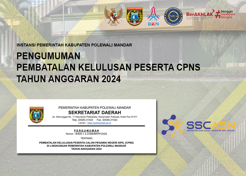PEMBATALAN KELULUSAN PESERTA CALON PEGAWAI NEGERI SIPIL (CPNS) DI LINGKUNGAN PEMERINTAH KABUPATEN POLEWALI MANDAR TAHUN ANGGARAN 2024 Merujuk Hasil Pengumuman Pj. Sekretaris Daerah selaku Ketua Panitia Seleksi Daerah Nomor : B-04/800.1.2.3/Panselda/CPNS/I/2025 Tanggal 10 Januari 2025 Tentang Hasil akhir Seleksi Calon Pegawai Negeri Sipil Instansi Pemerintah Kabupaten Polewali Mandar Tahun Anggaran 2024, dengan ini disampaikan hal-hal sebagai berikut : a. Sesuai Keputusan Menteri Pendayagunaan Aparatur Negara dan Reformasi Birokrasi Republik Indonesia Nomor 320 Tahun 2024 Tentang Mekanisme Seleksi Pengadaan Pegawai Negeri Sipil Tahun Anggaran 2024, pada diktum ketiga poin (f) disebutkan “memiliki kualifikasi pendidikan yang sesuai dengan persyaratan jabatan”; b. Sesuai Keputusan Menteri Pendayagunaan Aparatur Negara dan Reformasi Birokrasi Republik Indonesia Nomor 293 Tahun 2024 Tentang Penetapan Kebutuhan Pegawai Negeri Sipil di Lingkungan Instansi Pemerintah Tahun Anggaran 2024 pada diktum keempat disebutkan “pelaksanaan pengisian kebutuhan Pegawai Negeri Sipil tersebut, dilakukan oleh masing-masing Pejabat Pembina Kepegawaian Instansi Pemerintah dengan berpedoman pada peraturan perundang-undangan”; c. Sesuai Pengumuman Bupati Polewali Mandar Nomor B-389/Bupati/813/VIII/2024 Tanggal 16 Agustus 2024 Tentang Pengadaan Calon Pegawai Negeri Sipil (CPNS) Instansi Pemerintah Kabupaten Polewali Mandar Tahun 2024 pada bagian (I). Pengumuman Hasil Akhir dan Masa Sanggah Nomor 7 poin (c) disebutkan “terbukti kualifikasi pendidikannya tidak sesuai dengan jabatan yang dilamar maka PPK harus mengumumkan pembatalan kelulusan yang bersangkutan”; d. Sesuai hasil verifikasi dan validasi dokumen peserta CPNS pada detail usulan di Aplikasi Layanan Penetapan NIP SIASN BKN menyatakan Tidak Memenuhi Syarat;Informasi selengkapnya link dibawah ini >>FILE DOWNLOAD...